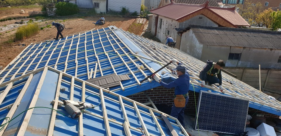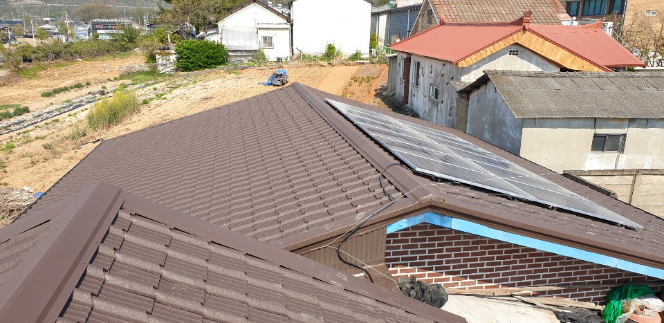 경기도 시흥시 안현동. 지붕공사를 위해 기존의 판넬지붕에 설치된 태양광패널을 잠시 분리작업후 칼라강판 평기와골로 개량공사후 태양광패널을 재설치한 사례.