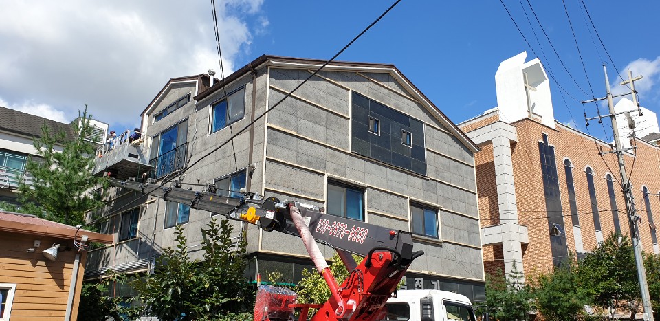 인천 서구 경서동. 비가 오면 빗물이 스며들던 현무암 외벽을 V250칼라아연도강판으로 깔끔하게 시공함.