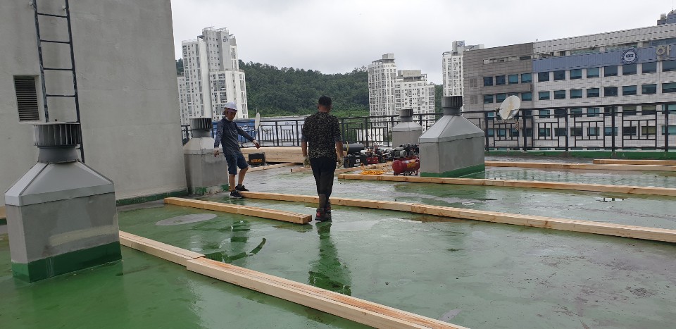 구리시 교문동. 오피스텔 10층 슬라브지붕을 밟고 다닐수 있도록 칼라강판 슬레이트골을 사용해 바닥시트형으로 시공함.