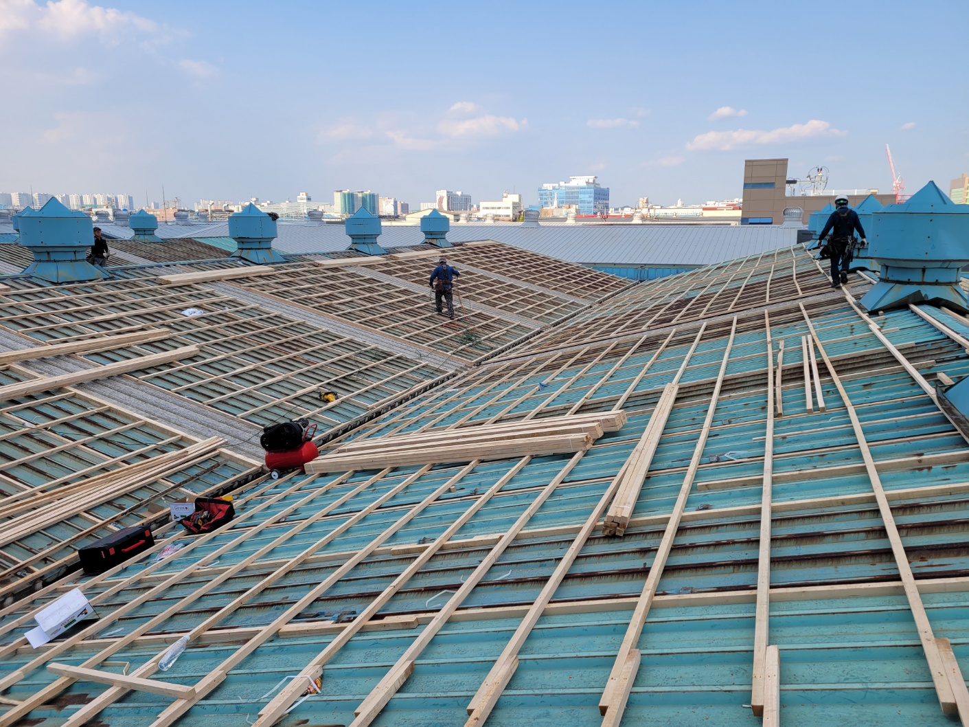 시흥시 정왕동. 기존의 노후된 V250 홑강판위에 정재각재로 하지작업후 아연도 칼라강판 슬레이트골로 지붕개량함.