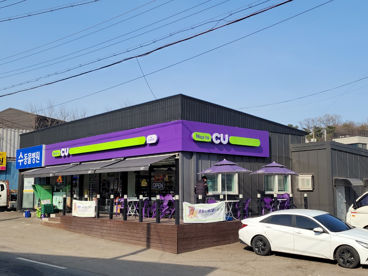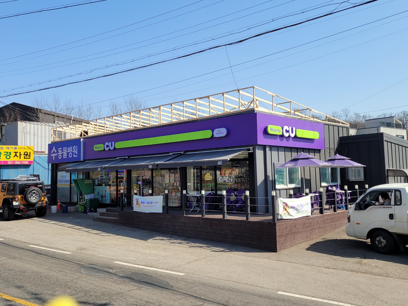 화성시 남양읍 장덕리. 편의점 슬라브지붕의 누수로, 투바이와 정재로 상을 짜서 외쪽지붕을 만든후 아연도칼라강판 슬레이트골로 덮고 벽체로 마감함.