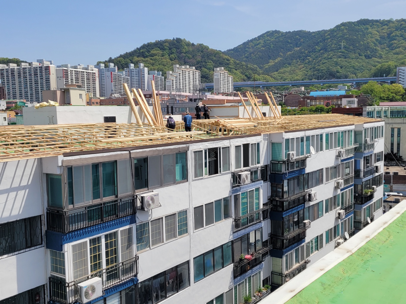 광주시 두암동에 위치한 아파트로, 옥상 슬라브 바닥의 누수로, 칼라강판 슬레이트골로 개량공사함.