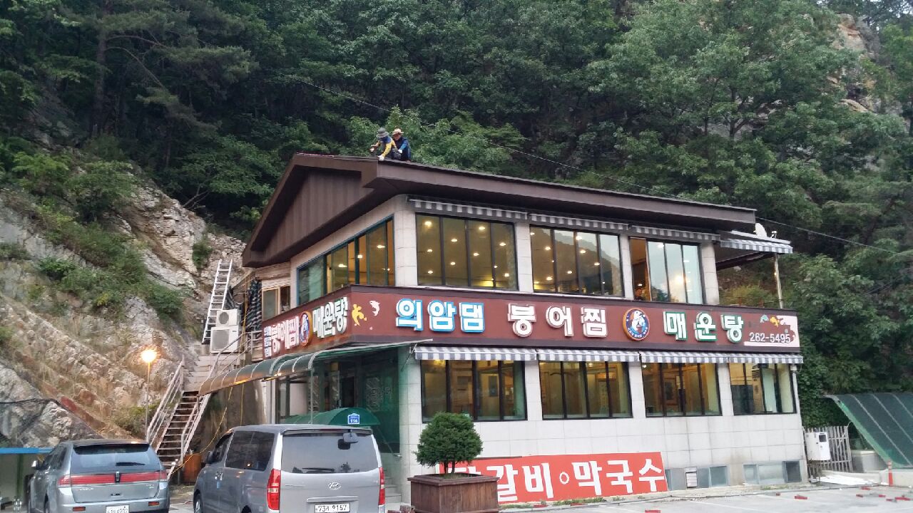 춘천의 유명한 음식점으로 기존의 슬라브 지붕에서 물탱크, 데스리 부분 등을 철거하고 철골로 지붕틀을 만들어 포스코 칼라강판으로 마무리한 사례입니다.