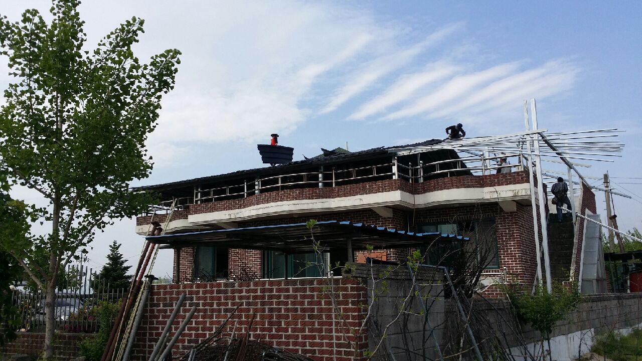 춘천시 동내면의 단독주택으로 기존 슬라브 지붕에서 지붕아래 옥상 공간 활용이 충분히 가능할 수 있도록 옥상 바닥에서 옥탑까지 철골로 새 지붕틀을 짜고 포스코 칼라강판으로 시공한 사례입니다.