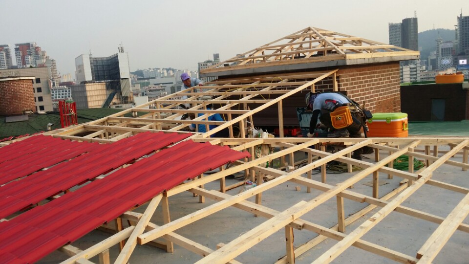 서울 창신동에 위치한 빌라로 작업조건이 좋지않고 지붕에 까치집이 많아 까다로운 공사였지만 아시바를 설치한후 노련한 시공팀의 기술로 투바이와 정재로 지붕틀을 짜고 칼라강판으로 멋지게 마무리하였습니다.